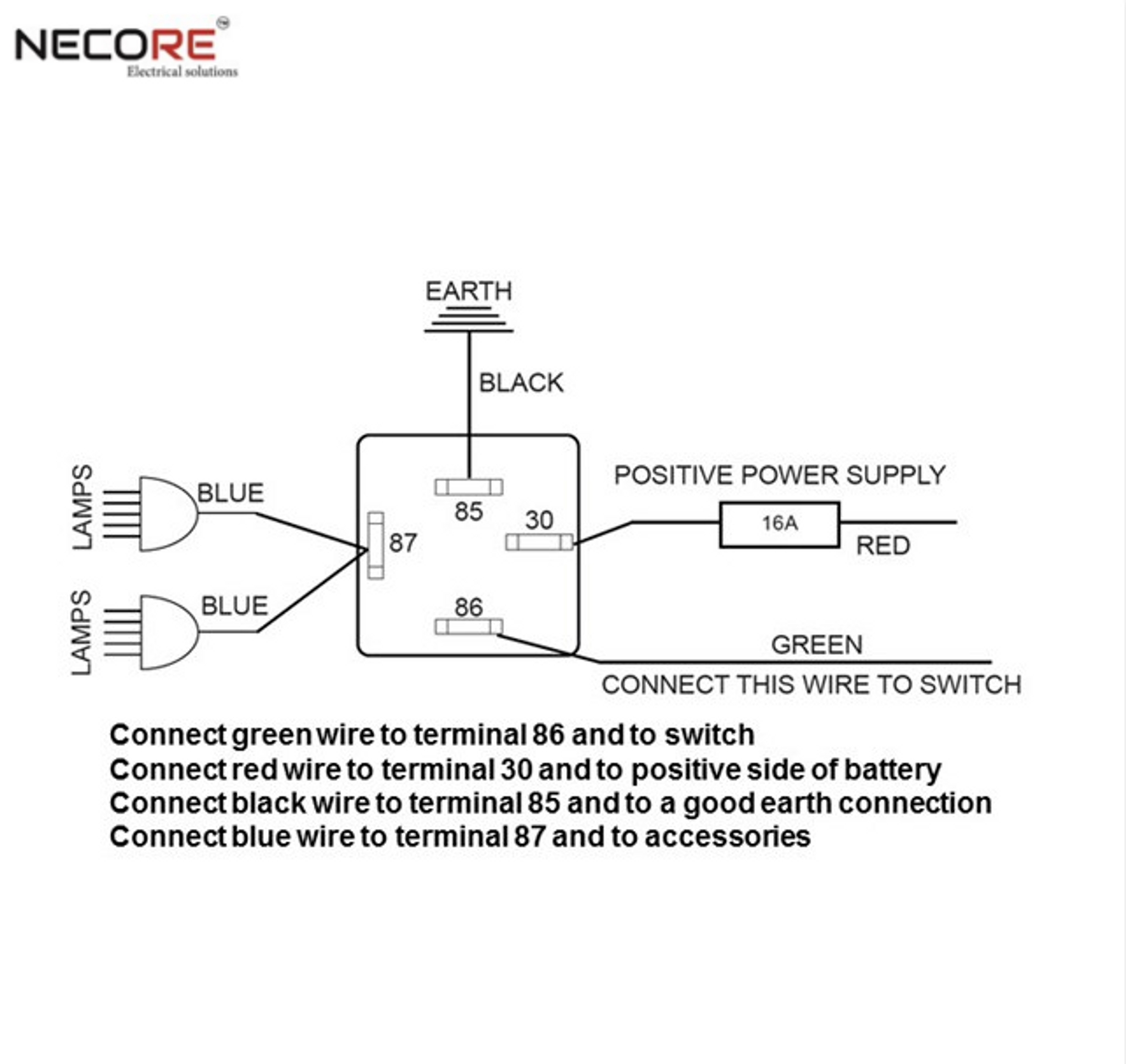 Butiksförpackad reläsats för inkoppling av 12 V extraljus. Komplett sats med anslutningskablar för två extraljus. Relä 30A, säkring 15A.