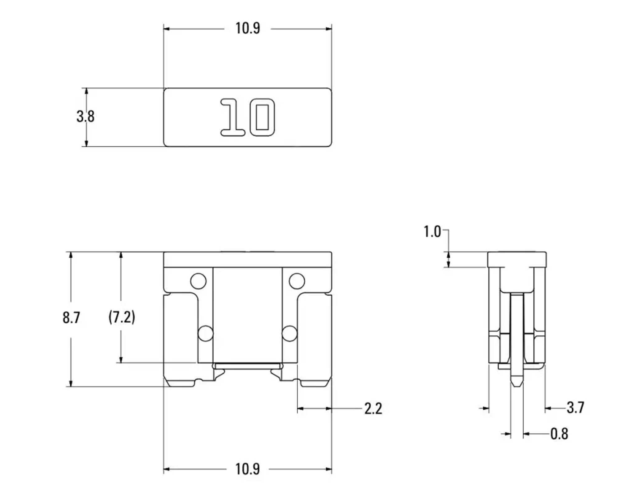 Specifikationer: Bredd: 10.9 mm Djup: 3.8 mm Höjd: 8.7 mm Material: PC (polykarbonat) Spänning (max): 58 V