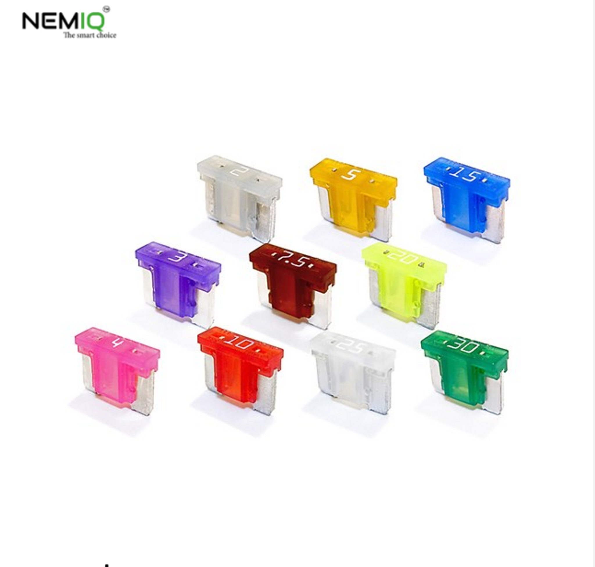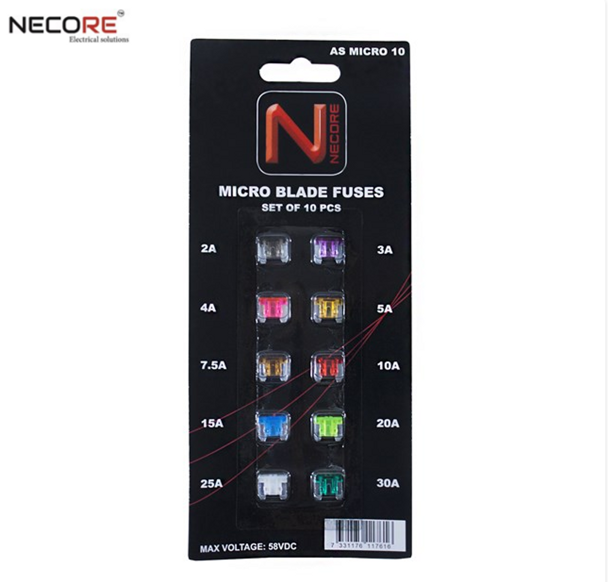 Säkrings-sortiment med 10 st MICRO flatstiftsäkringar. MICRO-säkringen benämns även Low Profile MINI, vilket egentligen är en benämning som bättre stämmer överens med säkringens mått jämfört med MINI/ATM-säkringen. Tillverkad enligt standard: ISO 8820-9.
